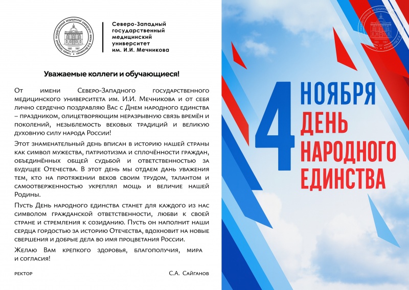 От имени Северо-Западного государственного медицинского университета им. И.И. Мечникова мы поздравляем Вас с этим знаменательным праздником, который наполнит Вас радостью встреч с родными и близкими, даст каждому новый заряд бодрости и оптимизма! Желаем Вам счастья, удачи, благополучия и успехов в осуществлении всех планов и начинаний! С Днем народного единства!