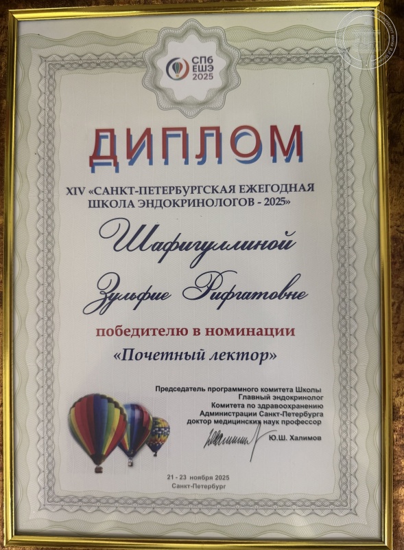 Открытие Школы ознаменовалось церемонией вручения наград, инициированной Профессиональной медицинской Ассоциацией эндокринологов Санкт-Петербурга. Среди специалистов, удостоенных высоких знаков отличия, – З.Р. Шафигуллина – заведующий эндокринологическим отделением Клиники имени Э.Э. Эйхвальда СЗГМУ им. И.И. Мечникова, Заслуженный врач Российской Федерации, кандидат медицинских наук, врач высшей категории.
