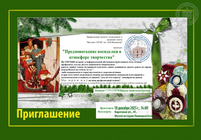 Профсоюзный комитет сотрудников и редакция газеты «Вестник СЗГМУ им. И.И. Мечникова» проведут встречу «Предновогодние посиделки в атмосфере творчества».