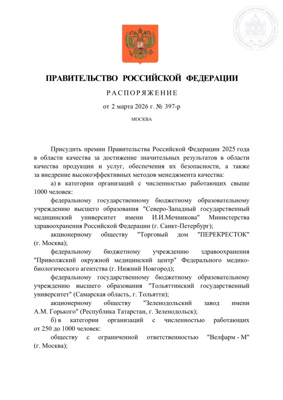 СЗГМУ им. И.И. Мечникова стал лауреатом премии Правительства Российской Федерации в области качества!