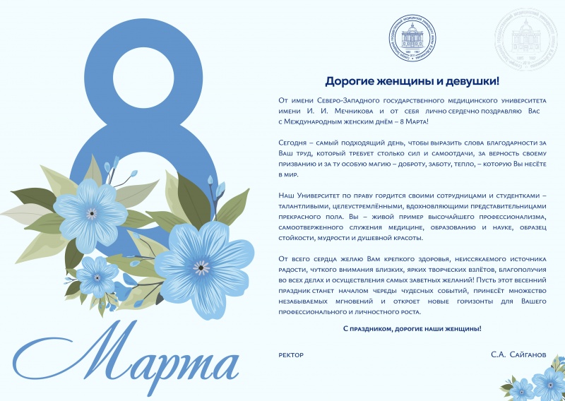 От имени Северо-Западного государственного медицинского университета им. И.И. Мечникова поздравляем Вас с Международным женским днем!